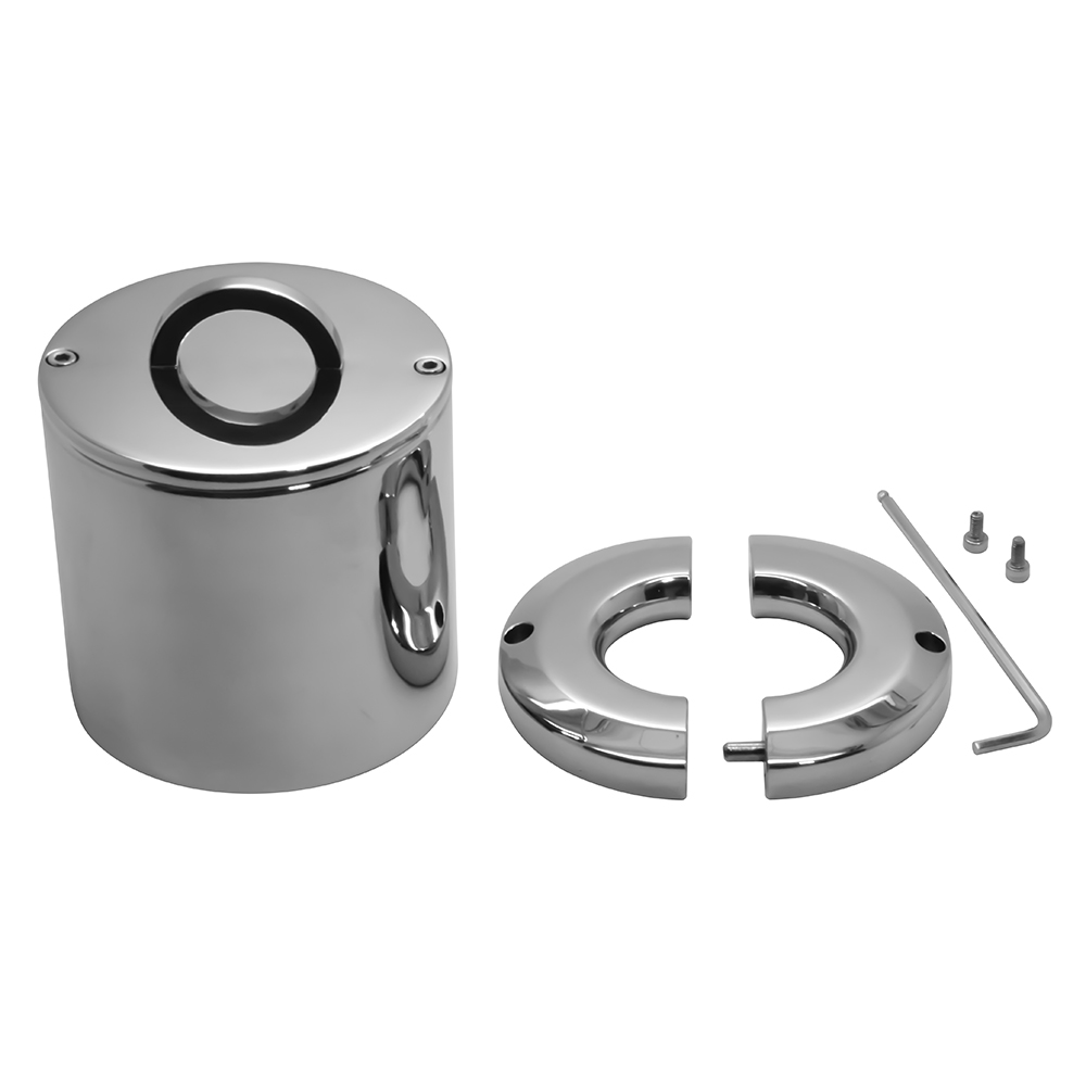 Your balls are first clamped with a stainless steel split collar, then stuffed into, and completely encased in the high grade surgical stainless steel cylinder. The collar is screwed tight onto the cylinder at the top, with two retaining bolts, and finally the base plate is screwed home below. There is also a loop on the base from which you can hang weights (as if 2.1 lbs is not enough!). Warm it up under the hot tap before putting it on, it feels great! Put plenty of SheaCoa butter on your balls to assist the Tamer to slide down your sac and achieve maximum stretch. Put a film of Vaseline on the steel joins and try filling the Tamer with hot water for extra fun, it adds to the sensation......and the weight! I've recently started adding steel ball bearings inside mine and it rattles intriguingly!