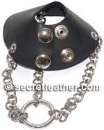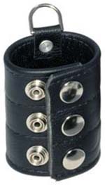 A tapering leather collar that grips the scrotum and fastens by way of press studs. Enables a varying amount of weight to be attached and readily detached. Used in 'cbt' sessions, but also invaluable in assisting the attachment of other stretchers, metal or leather, especially if the wearer does not have a lot of stretch initially. Can be worn on its own without weights, and gives a pleasant erotic charge. More