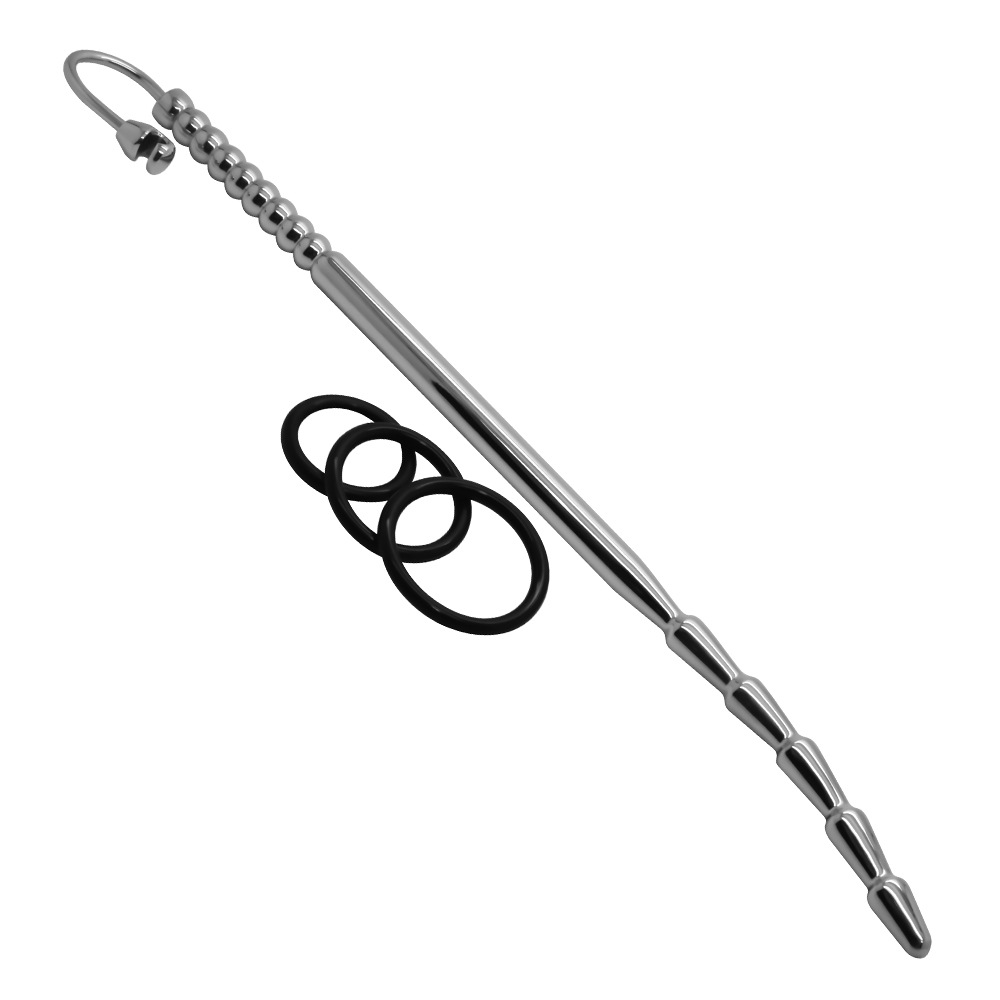 Made from 316L medical-grade surgical steel, this 28cm (11-inch) wonder has a curved end with a 10mm diameter. Its unique design features a hook for one of the three silicone glans rings provided. The wand includes 6 tapering sections leading to a solid shaft and finishes with a row of 8 balls.